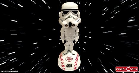 As part of STAR WARS Weekend, fans can purchase a special ticket package that includes an exclusive Stormtrooper bobblehead. Must purchase your game ticket through this offer to receive the bobblehead. Available while supplies last only at reds.com/StarWars.